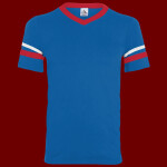 4.8 ounce 50% polyester/50% cotton jersey knit * Contrast color V-neck collar * Set-in sleeves with contrast color sleeve stripes