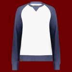* 7.6 ounce 55% polyester/41% cotton/4% rayon, super soft fleece * Ladies' fit * Woven label * Exterior faux leather logo loop label * Contrast color V insert at center front neck * Raglan sleeves * Rib-knit collar, cuffs and bottom band